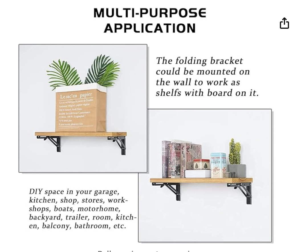- MULTI-PURPOSE APPLICATION】: The wall shelf brackets could be mounted on the wall to work as shelfs with board on it, can allow more DIY space in your garage, kitchen, shop, stores, workshops, boats, motorhome, backyard, trailer, room, kitchen, balcony, bathroom, etc.