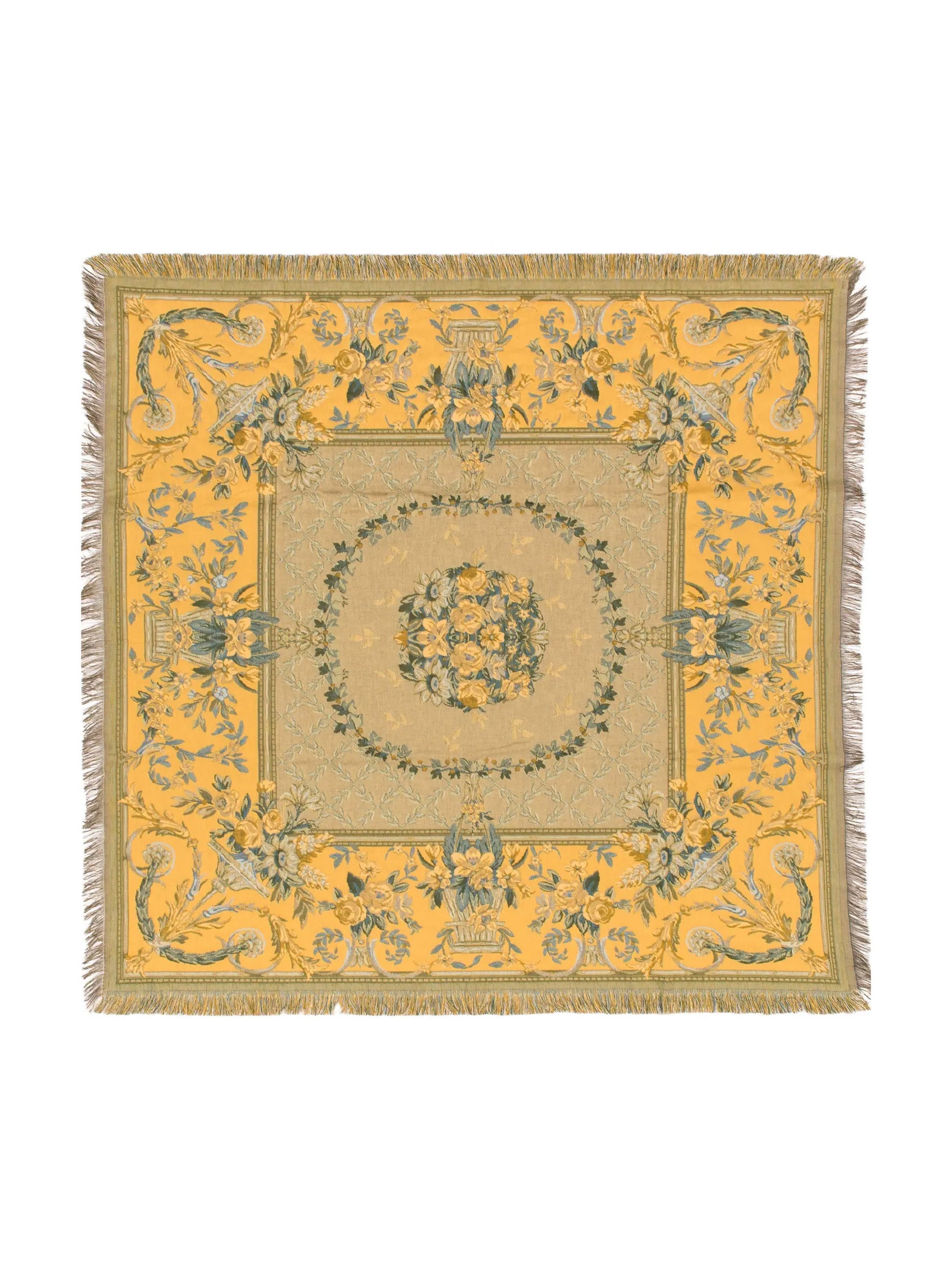 An Old World loomed yellow and French blue formal garden design is woven into a traditional French sofa or bed throw with 100% cotton thread and finished with a short fringe. We love this for use as a tablecloth for serving tea or a spring themed lunch garden party.