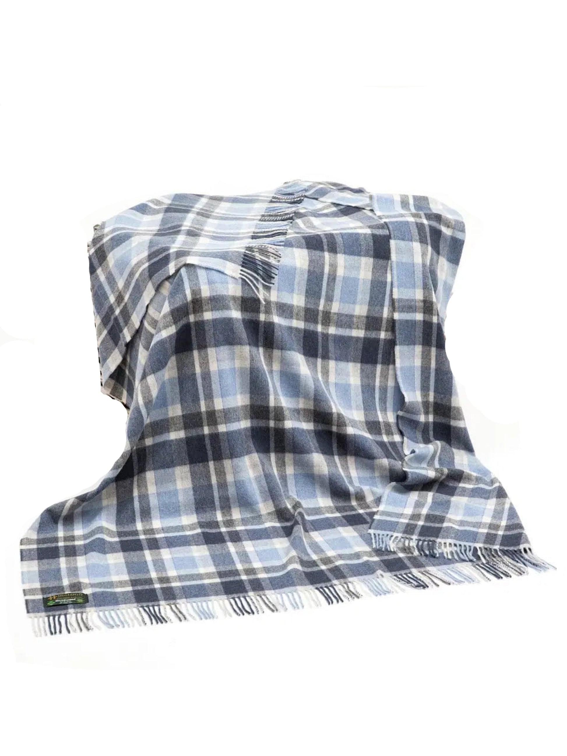 An Irish wool throw featuring shades of blue and white with a decorative fringe.